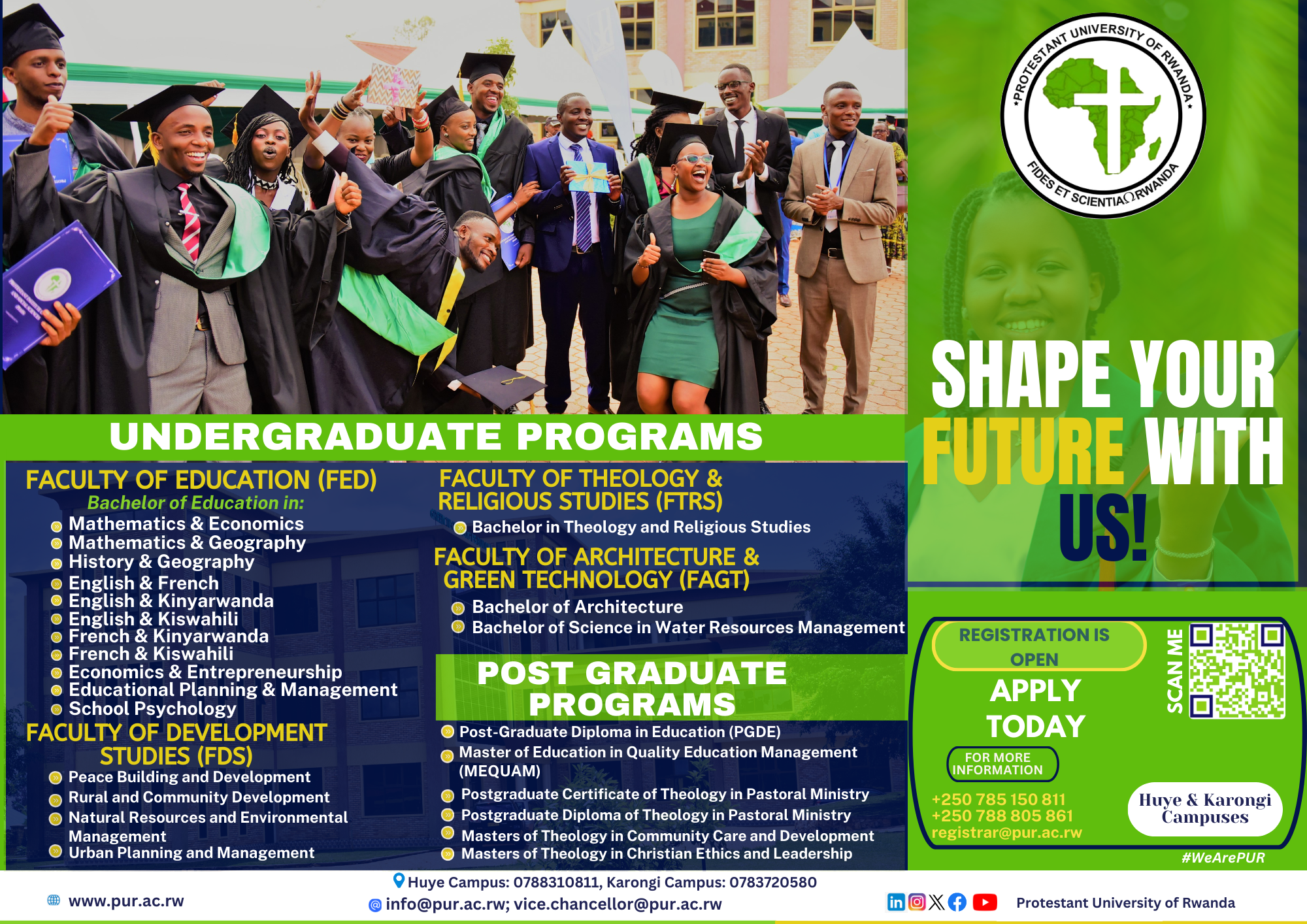The Protestant University of Rwanda (PUR) is a non-governmental, accredited higher learning institution owned by various Protestant churches in Rwanda, operating as a faith- based organization. It continues the efforts initiated by the churches through the School of Theology, known as the “École de Théologie de Butare (ETB),” which was established in 1970 by two Protestant churches: The Presbyterian Church in Rwanda (EPR) and the Union of Baptist Churches in Rwanda (UEBR). The school was founded to address the shortage of trained pastors within Protestant churches. Over time, other Protestant churches joined the original two founders.